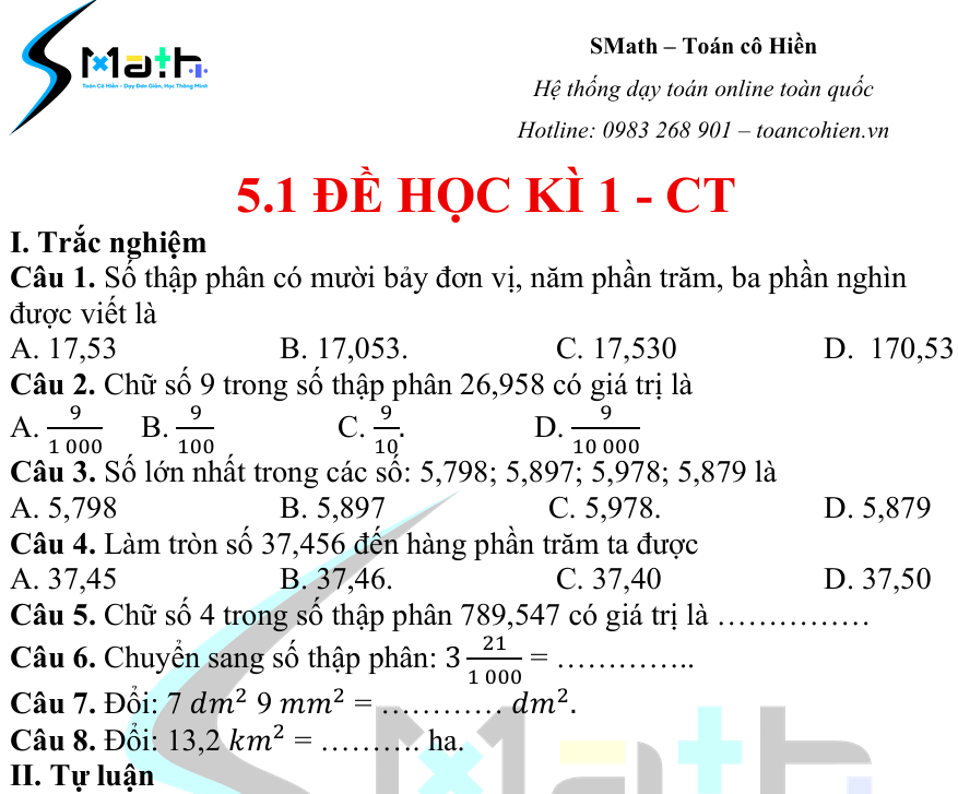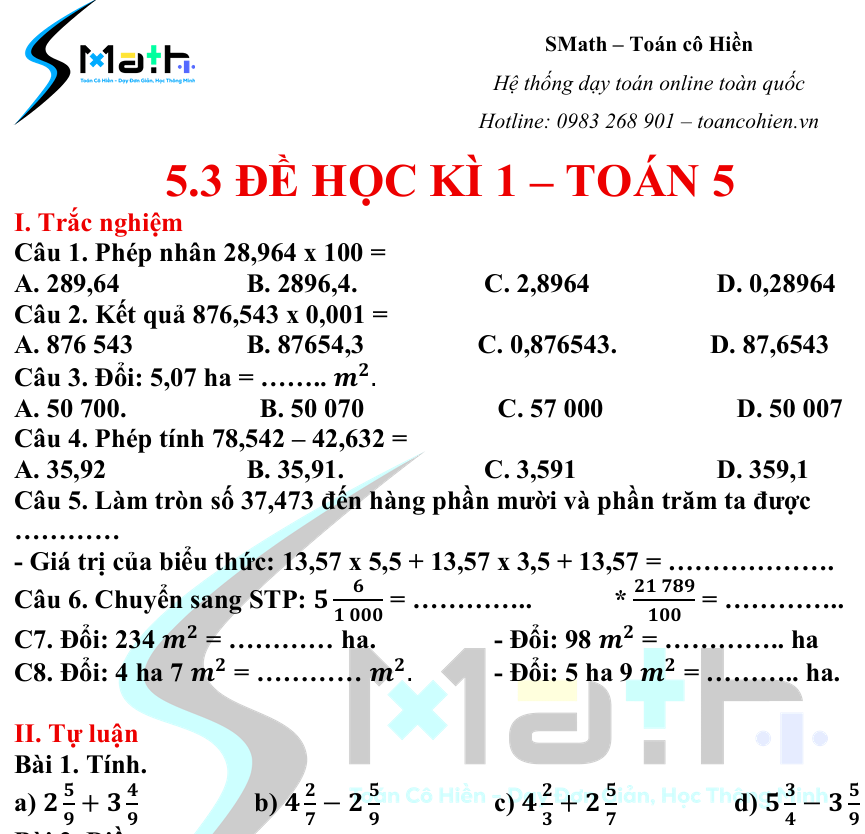 Đề học kì 1 số 1 - Toán 5 Kết nối