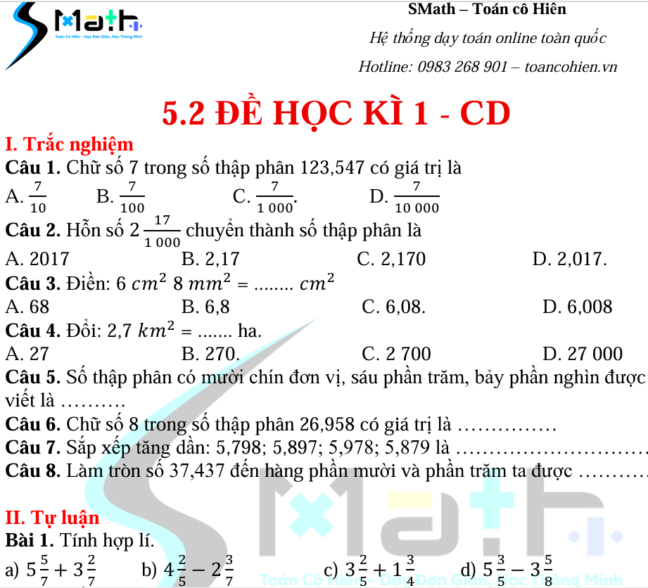 Đề học kì 1 số 1 - Toán 5 Cánh diều