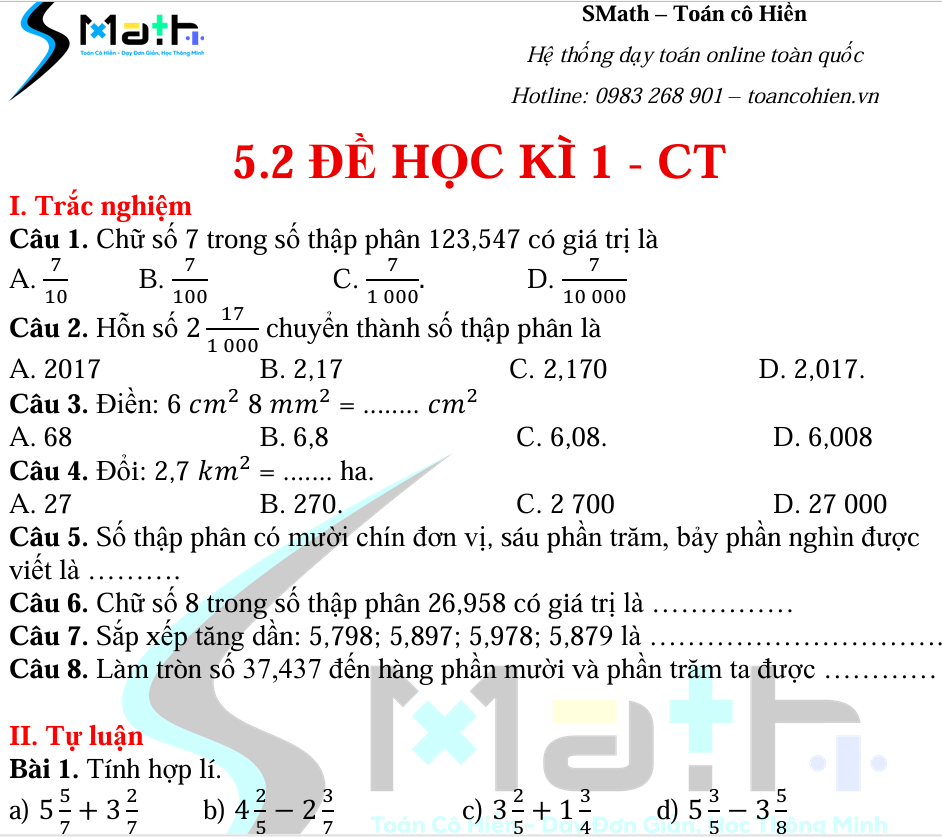Đề học kì 1 số 1 - Toán 5 Chân trời