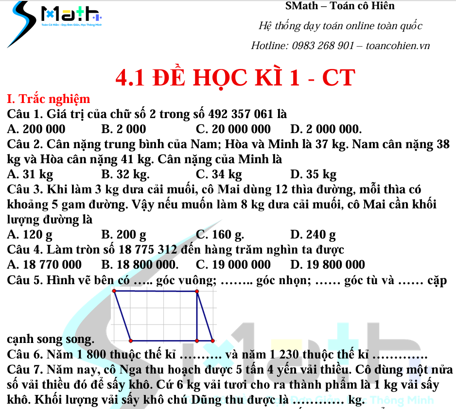 Đề học kì 1 số 1 - Toán 4 Chân trời