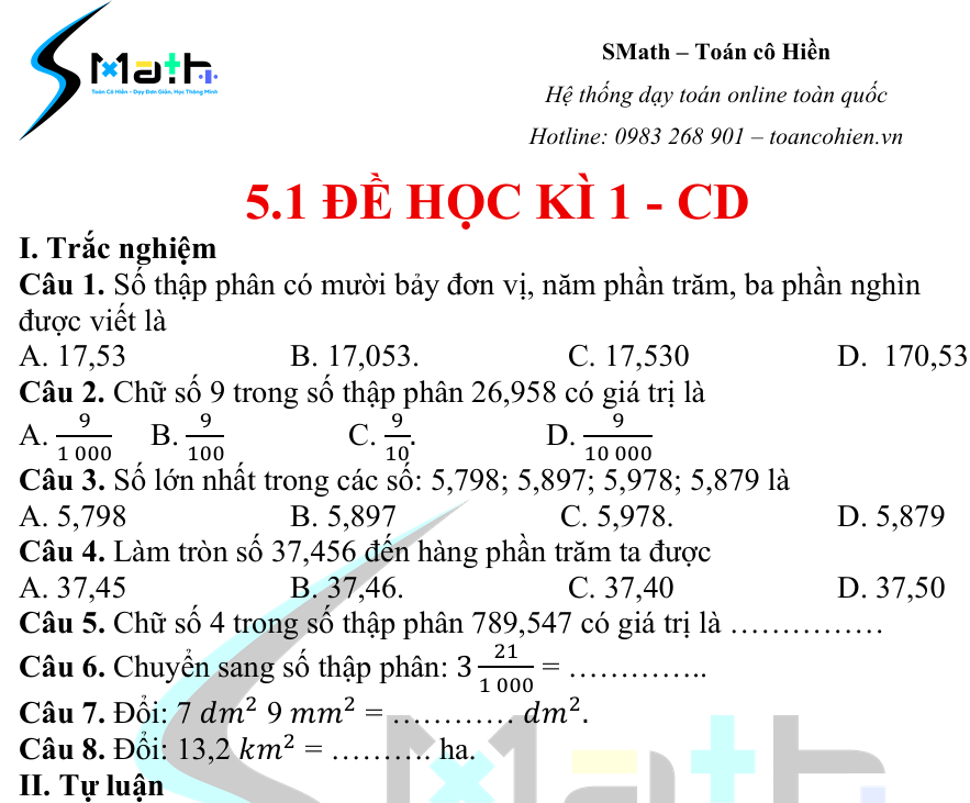 Đề học kì 1 số 1 - Toán 5 Cánh diều