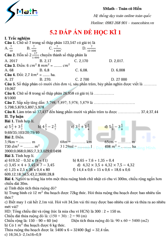 Đề học kì 1 số 2 - Toán 5 Chân trời